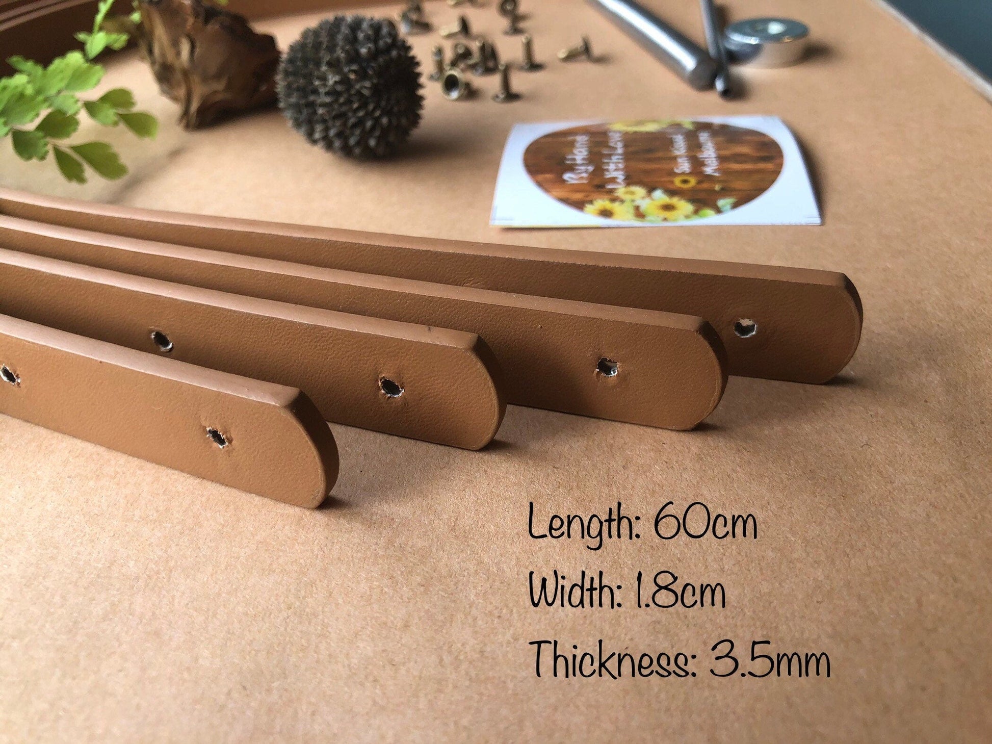 Installation: 2 pre-punched holes each end, each strap comes with 4 sets of matching rivets in antique brass